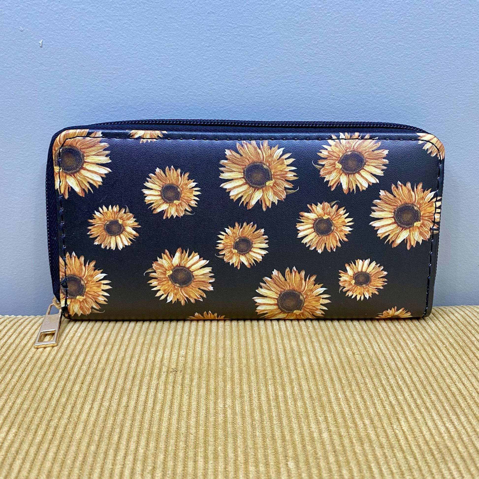 Wallet - Faux Leather - Medium Sunflowers on Black Background