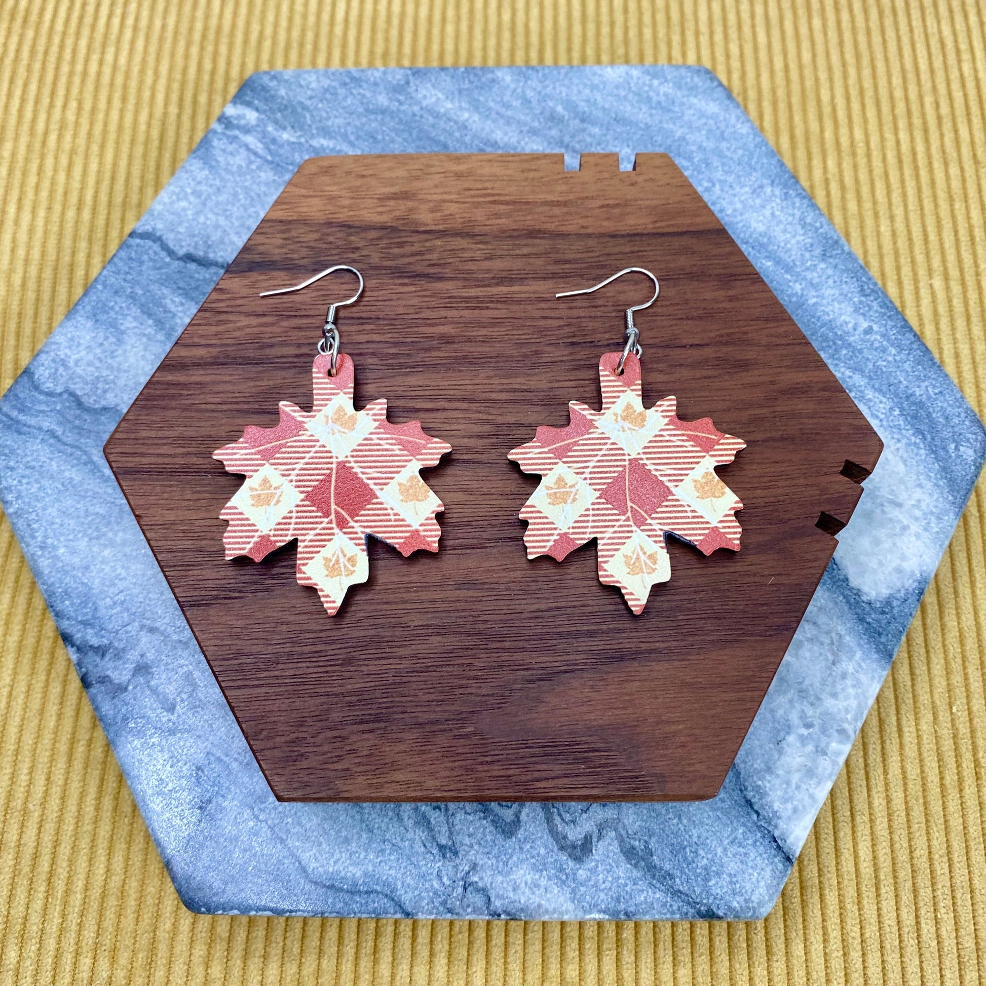 Wooden Dangle Earrings - Fall - Plaid Leaf